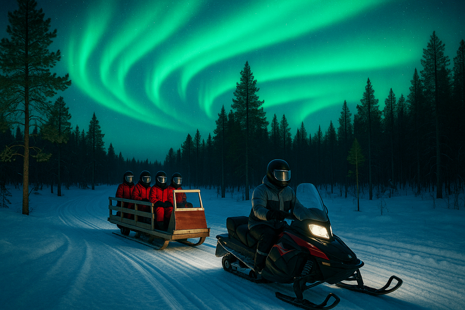 As darkness falls and the stars appear, your journey begins — gliding through snowy forests and frozen landscapes in a comfortable sled pulled by your guide’s snowmobile. Relax, enjoy the silence of nature, and keep your eyes on the sky for the glowing Northern Lights.