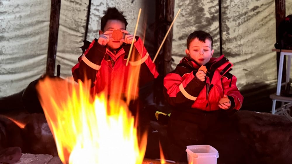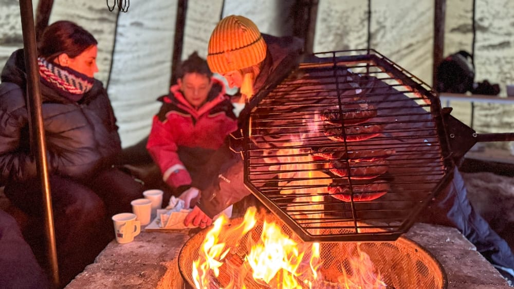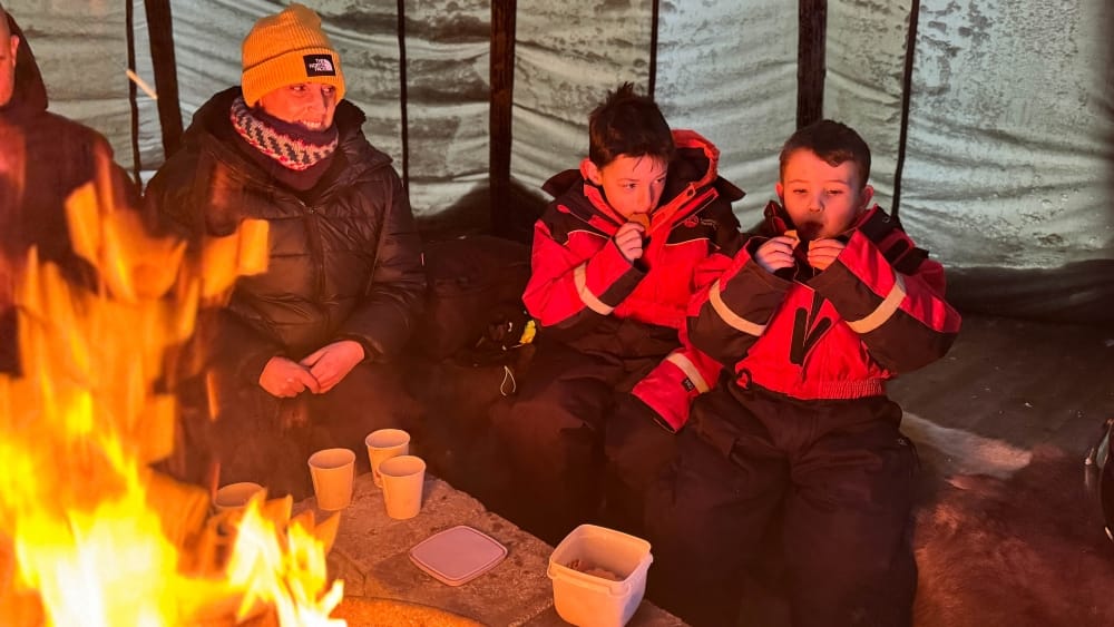 While the children enjoy riding, parents can relax and warm up inside the cozy private hut (kota) by the open fire, grill sausages, and sip on a warm drink (coffee or tea). After the stopover, the group returns together on snowmobiles.