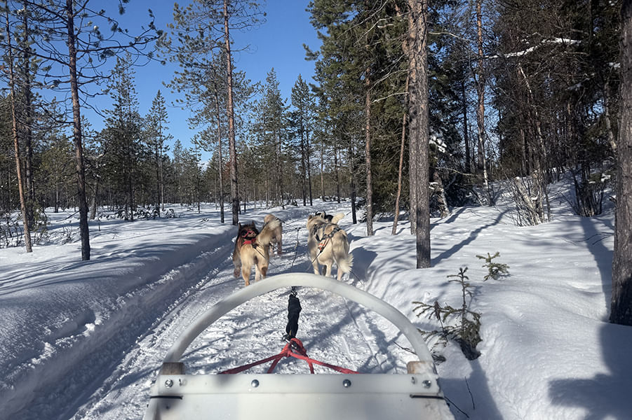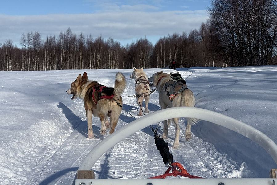You’ll embark on a self-driven 5-6 km husky safari, following a scenic trail through peaceful forest paths and open snow-covered fields. The landscape offers a different experience compared to river routes — more sheltered, quiet, and intimate. The ride lasts around 20-30 minutes, including a midway stop where driver and passenger can swap roles.