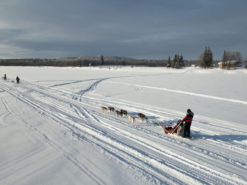 The track length is 10 km and approximate riding time is 30-40 min. The ride time can vary, as it always includes a stop-over and is dependent on the weather conditions. During the stop-over musher and passenger can swap.