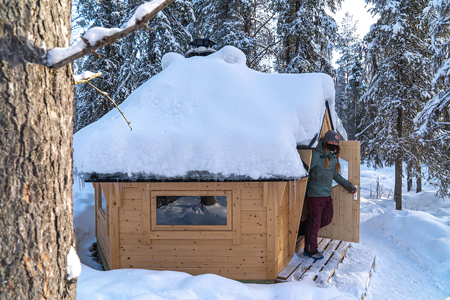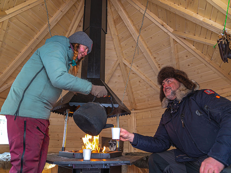 The track lies partly in the forest and partly on a beautiful frozen river. After the ride we have a chance to say thanks to our runners and take photos with them. We will walk around the kennel to meet the other dogs and then cuddle and pet the dogs and take photos with them in a special area of the kennel. Then we invite you inside our cozy hut (kota) to warm up around the open fire, having hot berry juice with cookies. The host will talk about life with the dogs and answer questions.