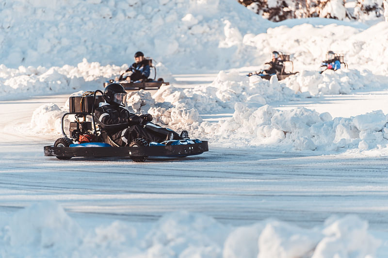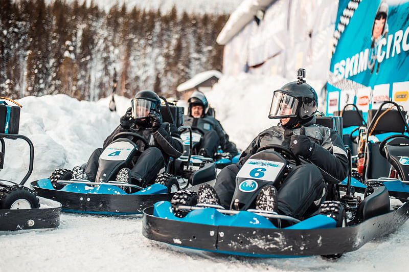 Ice-karting track is located just 5 minutes away from the village. Upon arrival you will go inside the warm house for brief safety instructions rules and driving tips. You will change to winter-racing gear, including helmets, hoods, shoes, gloves and overalls. Then you will head to the ice-track with up to 8 go-karts equipped with studded tires and silent four-stroke engines. Standard program includes driving a go-cart 2 laps 15 min each with a 15 min break in between. Hot juice is served throughout the event by the open fire outdoors.