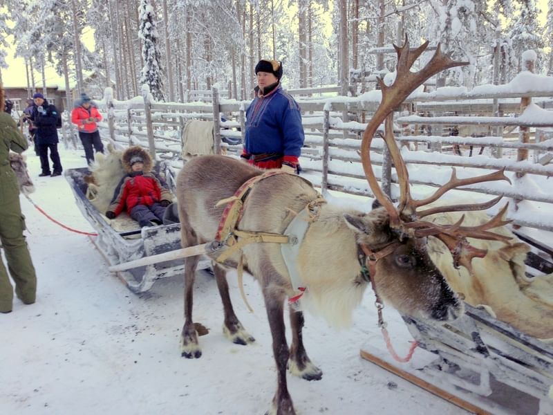 You will be guided to the reindeer sleds and go for a reindeer ride (about 1 km) through the beautiful pine forest. You’ll be able to take pictures with the reindeer and feed them with lichen. Depending on the group and season your host might be able to take you inside the reindeer corral, where you can experience a “reindeer therapy” - a close encounter with young reindeer calves. You can also check out old buildings around the farm, which have a nice collection of old Lappish artifacts from the reindeer herders. After the ride, you can taste Finnish warm berry juice in the old café (or mulled non-alcoholic wine “glöggi” only in the period 20.12-10.1) and fresh home-made donuts (traditional “munkki” in Finnish), buy souvenirs from reindeer antlers and conserves from local berries.