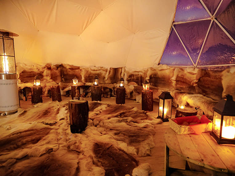 Polarman will then invite you inside our warm Aurora dome. The temperature inside stays +15 degrees or higher. You can sit comfortably and watch our blazing fireplace, while we serve you warm drinks and cookies.