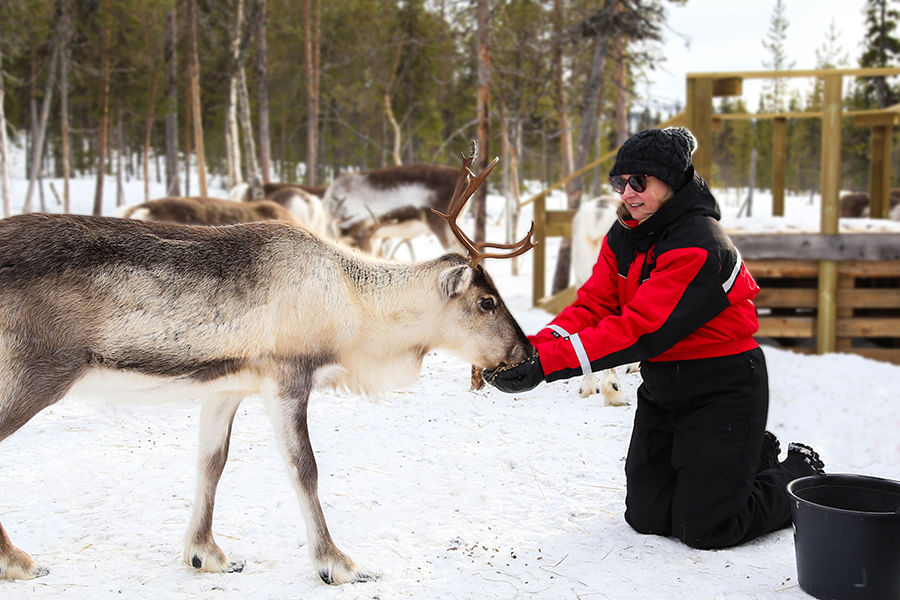 This immersive moment — walking quietly among the semi-wild animals, offering food by hand, surrounded by snowy trees and stillness — is what we call “reindeer therapy.” It's a peaceful, grounding experience that brings guests closer to Arctic nature and wildlife than ever before.