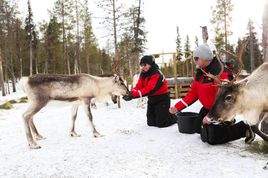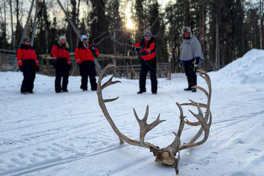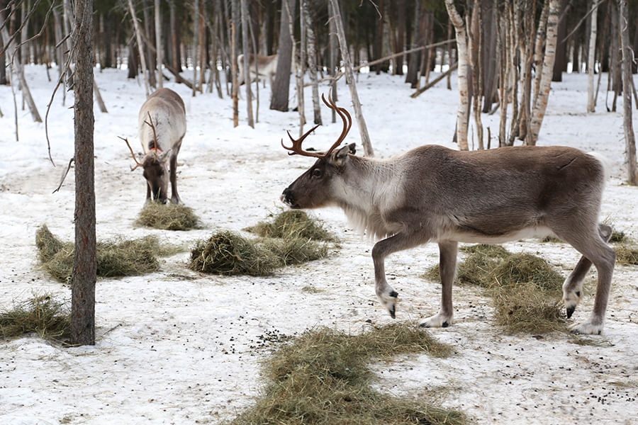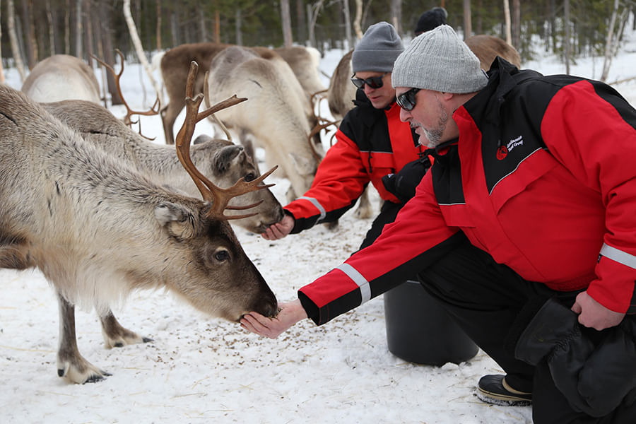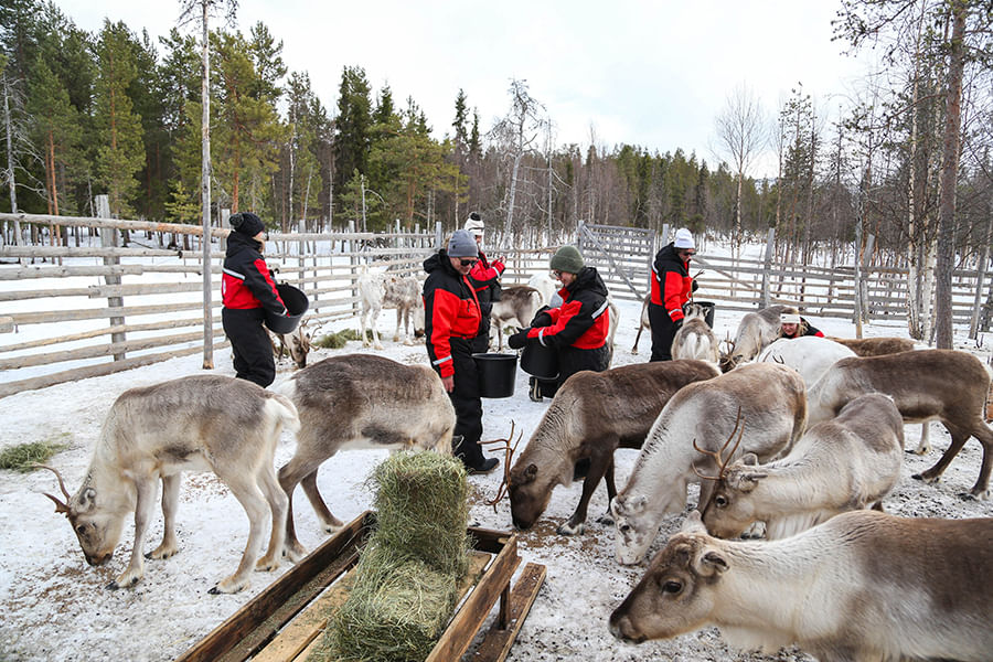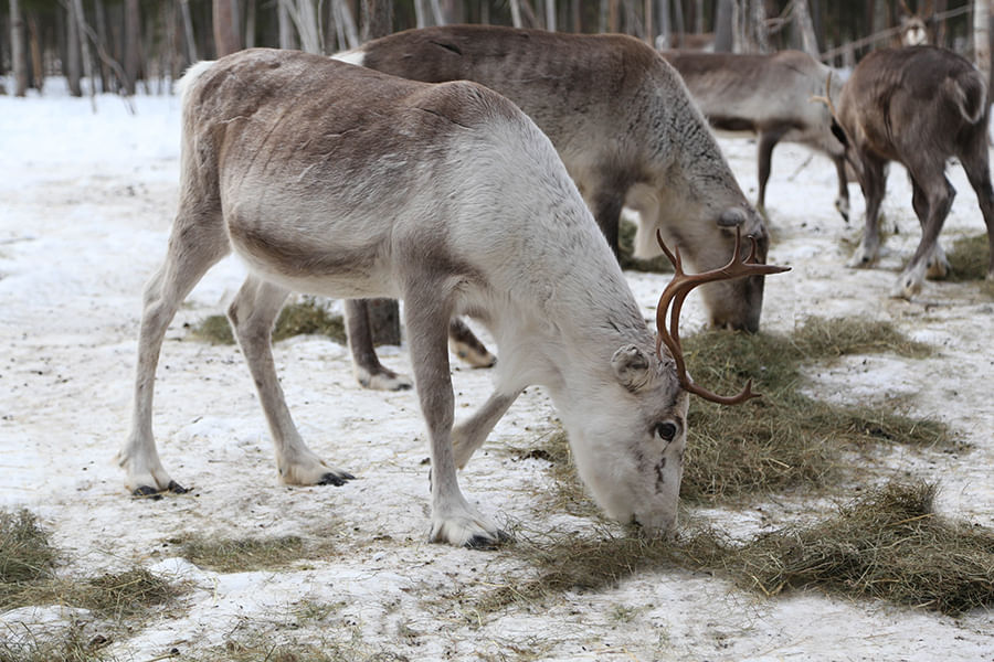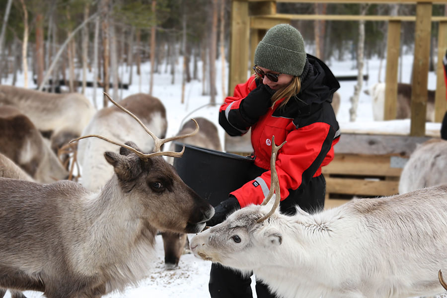 You will be given a bucket of feed — typically hay and specially formulated pellets — and start feeding the reindeer yourself. Moving slowly through different feeding areas, you'll have the chance to interact with dozens of semi-wild animals. Some reindeer may come close enough to touch, while others keep a polite distance, maintaining their natural instincts.