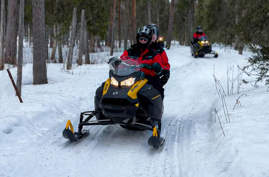 Your guide will provide a safety briefing and driving instructions. Adults ride their own snowmobiles, while children sit in a sleigh pulled by the guide’s snowmobile.