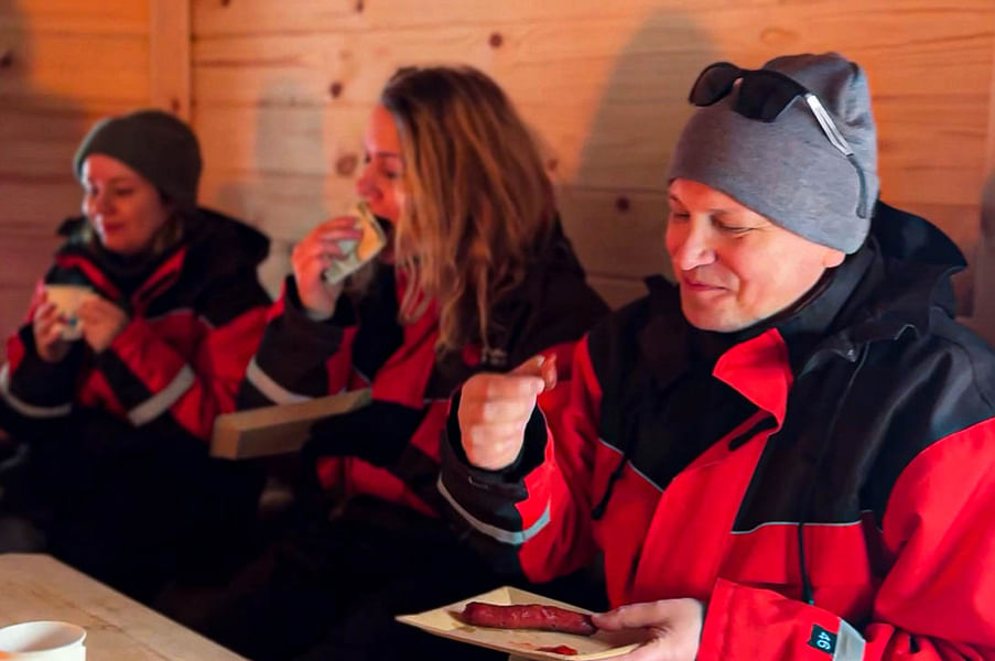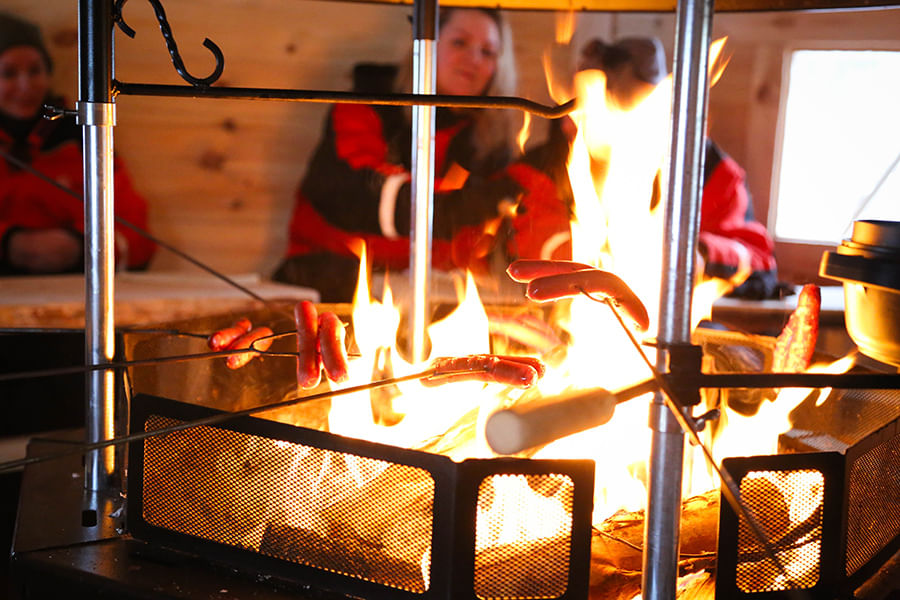 Then it’s time for a fun and authentic Arctic tradition: grilling your own reindeer sausages over the open fire using long sticks. This hands-on experience is a beloved part of Finnish and Lappish culture. The sausages — made from ethically sourced, local ingredients — are full of flavor and taste even better after outdoor adventure. Vegetarian or other dietary options are available upon request.
