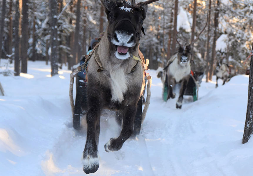 Reindeer therapy program: super-safari on reindeer sleds through the beautiful winter forest at relaxed pace